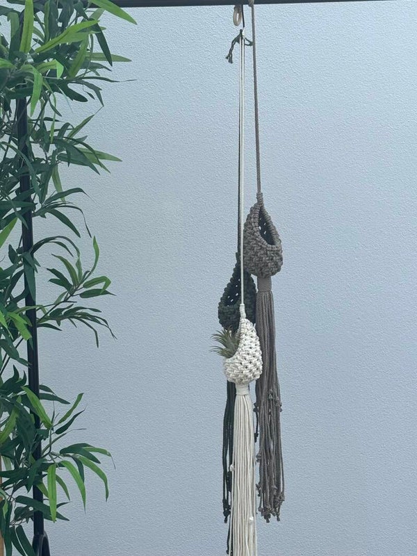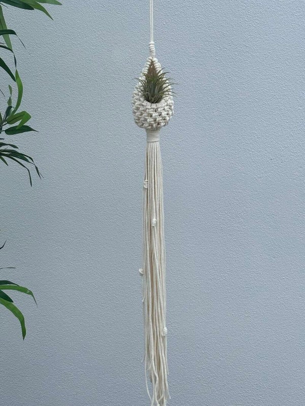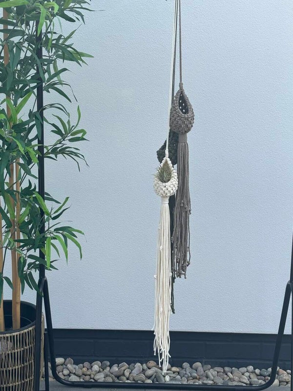 Beautifully handmade macrame air planter,is a decorative and functional piece made from cord and braided cord.These little pods create a stylish holder for all your air plants and succulents.The air planters come in a range of colours. They will create a and delightful addition to your home decor L:100cm W 8cm made from 100% recycled cotton.